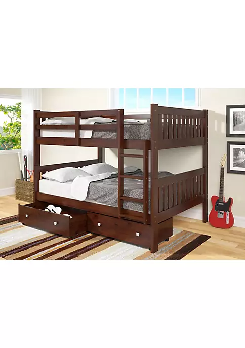 This solid pine bunkbed is sure to be the center of childhood memories. The dark cappuccino color pairs well with any decor. The classic mission style looks great in any room. Also included are dual storage drawers for added space saving options.