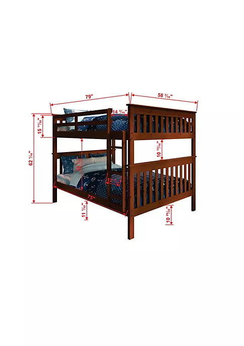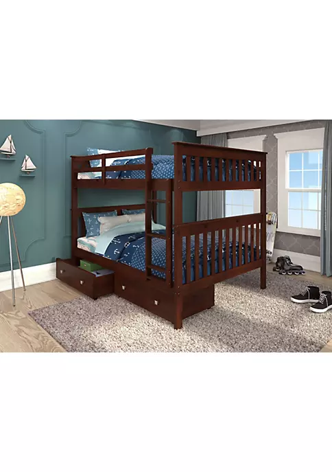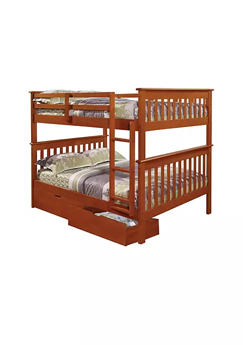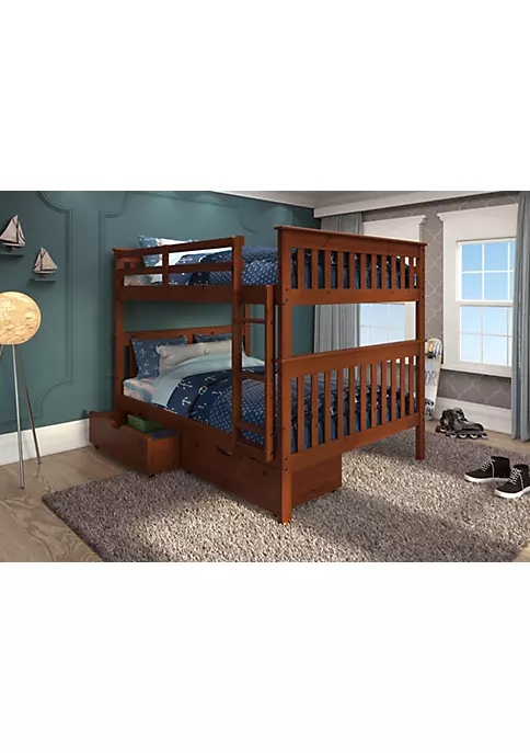 Our Full Over Full Mission Style bunkbed with Merlot finish will add warmth to any bedroom. This bed comes with a mattress ready slat system, so no Bunkie board is required. The included dual under bed drawers are great way to help keep the room organized.