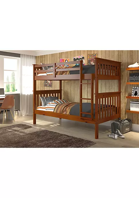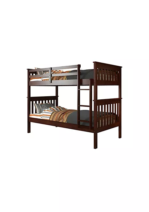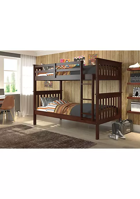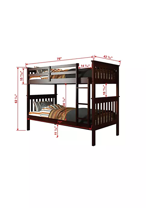 With a sturdy construction and espresso finish, this stately piece is great for any child’s room. The attached ladder gives you easy access to the top bunk. Our mattress ready slat system is already incorporated, eliminating the need for box springs.