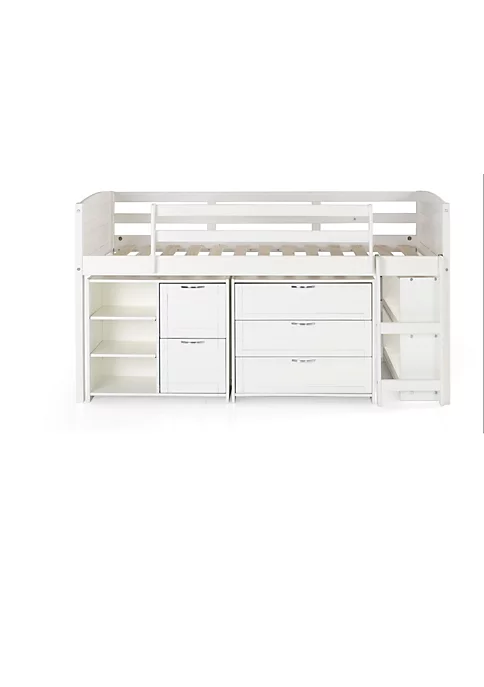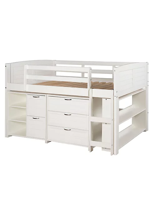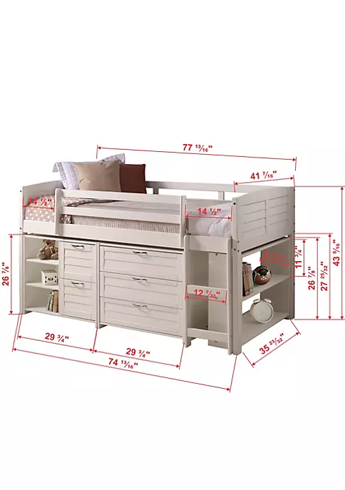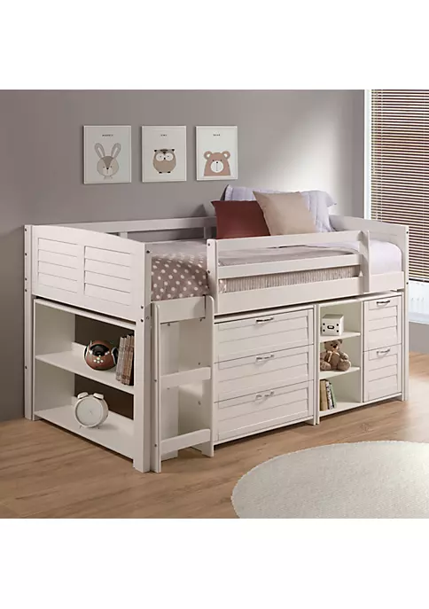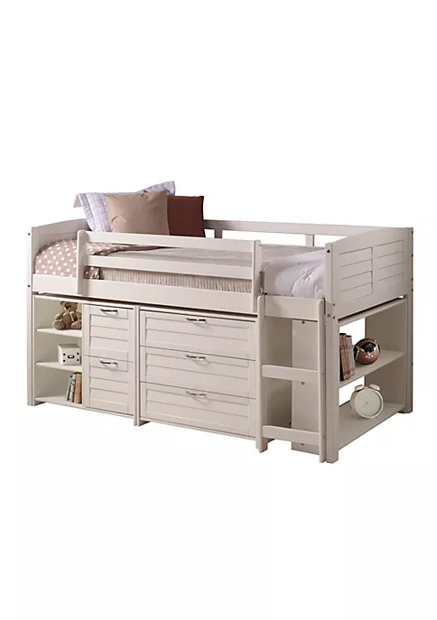 The louvered low loft bed makes a small room fun, with large under bed area for storage or play. The louvered design is timeless and can make a room easy to decorate and give it a warm inviting look. The 3-drawer chest adds storage under the louvered low loft bed. The 2-drawer chest has deeper drawers for larger items storage, and a small shelf beside it. The large bookcase adds storage at the foot of the bed.