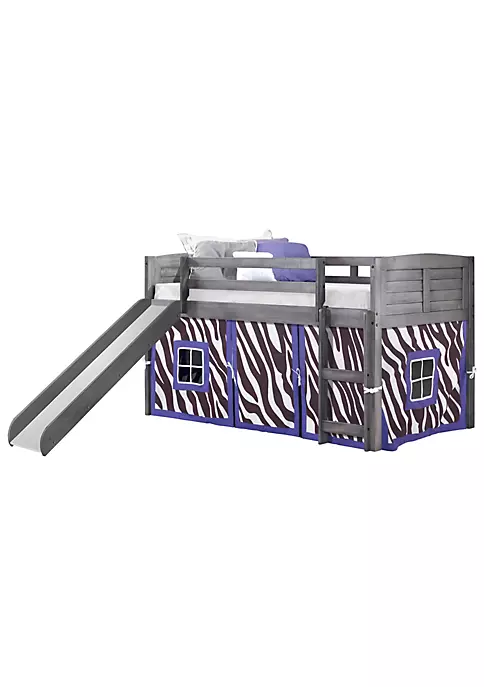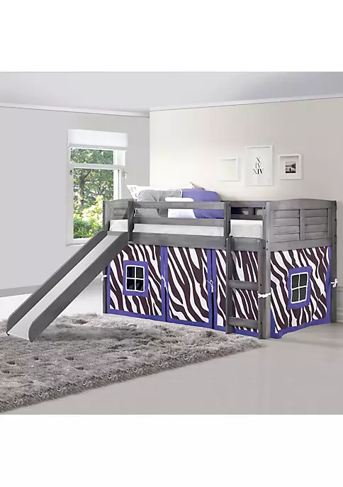 The louvered low loft bed makes a small room fun, with large under bed area for storage or play. The louvered design is timeless and can make a room easy to decorate and give it a warm inviting look. Blue tent fabric can be used as a fun play area or to conceal storage. The slide makes it an adventure to get up every morning and slide into the day.