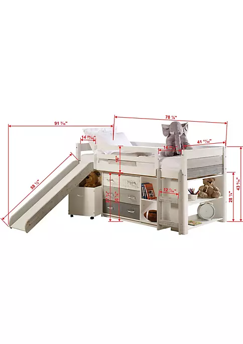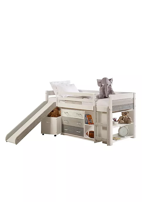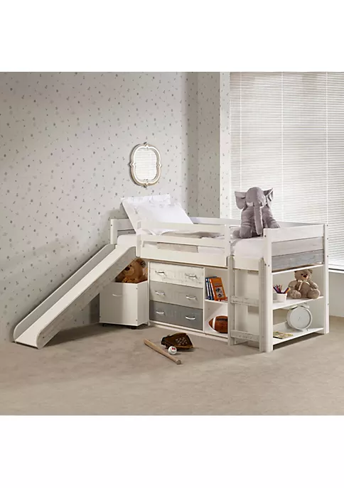 This Low Loft is the perfect starter bed for your little one. The slide feature provides a fun way to get out of bed. This Loft has a variety of space saving features including a 3-drawer chest/shelf, Bookcase, and a set of toy boxes.