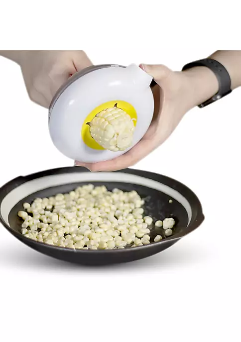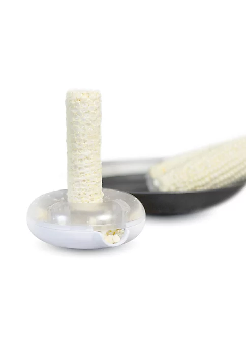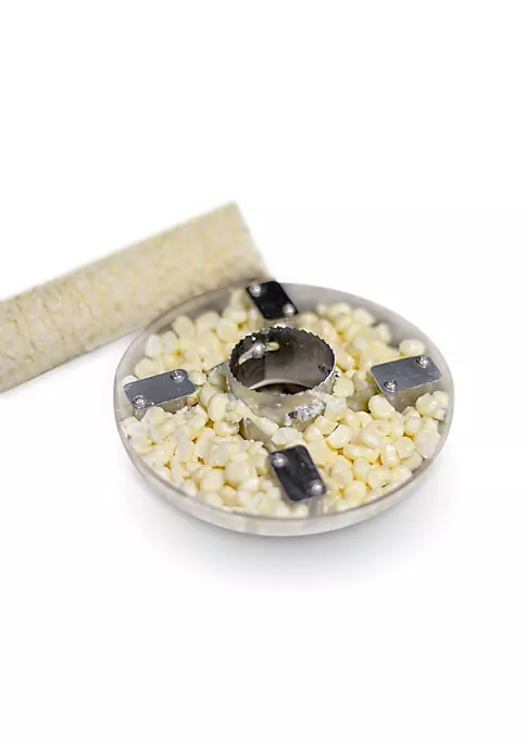 STRIP CORN OFF THE COB IN ONE EASY MOTION. Circular stainless steel blade flexes and hugs the cob tightly getting every kernel.
