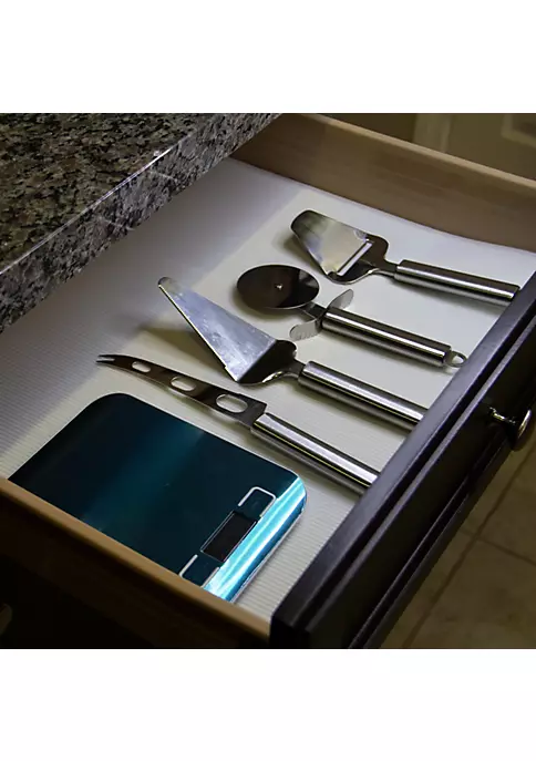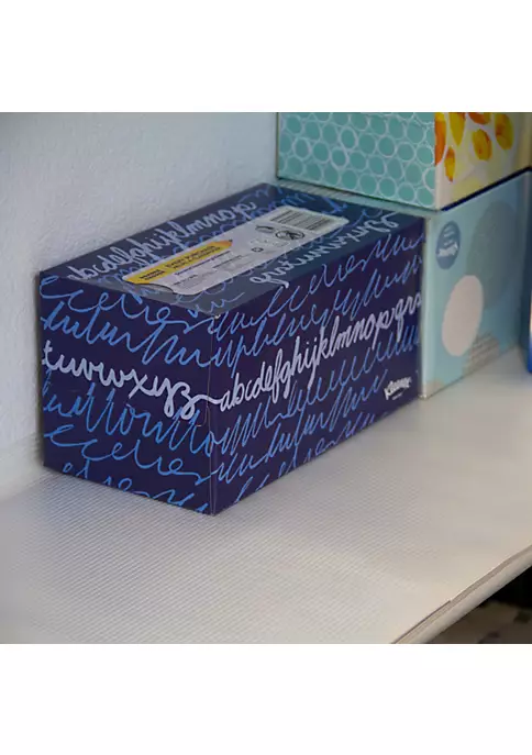 HEAVY DUTY NON-ADHESIVE SHELF LINER PROTECTS CABINETS FROM DAMAGE. CLEAR COLOR. NON ADHESIVE. RIBBED TEXTURE. ROLL MEASURES 10 FT X 12 INCHES. Made from super durable EVA plastic. EASILY CUTS TO SIZE. LAYS FLAT, WIPES CLEAN.